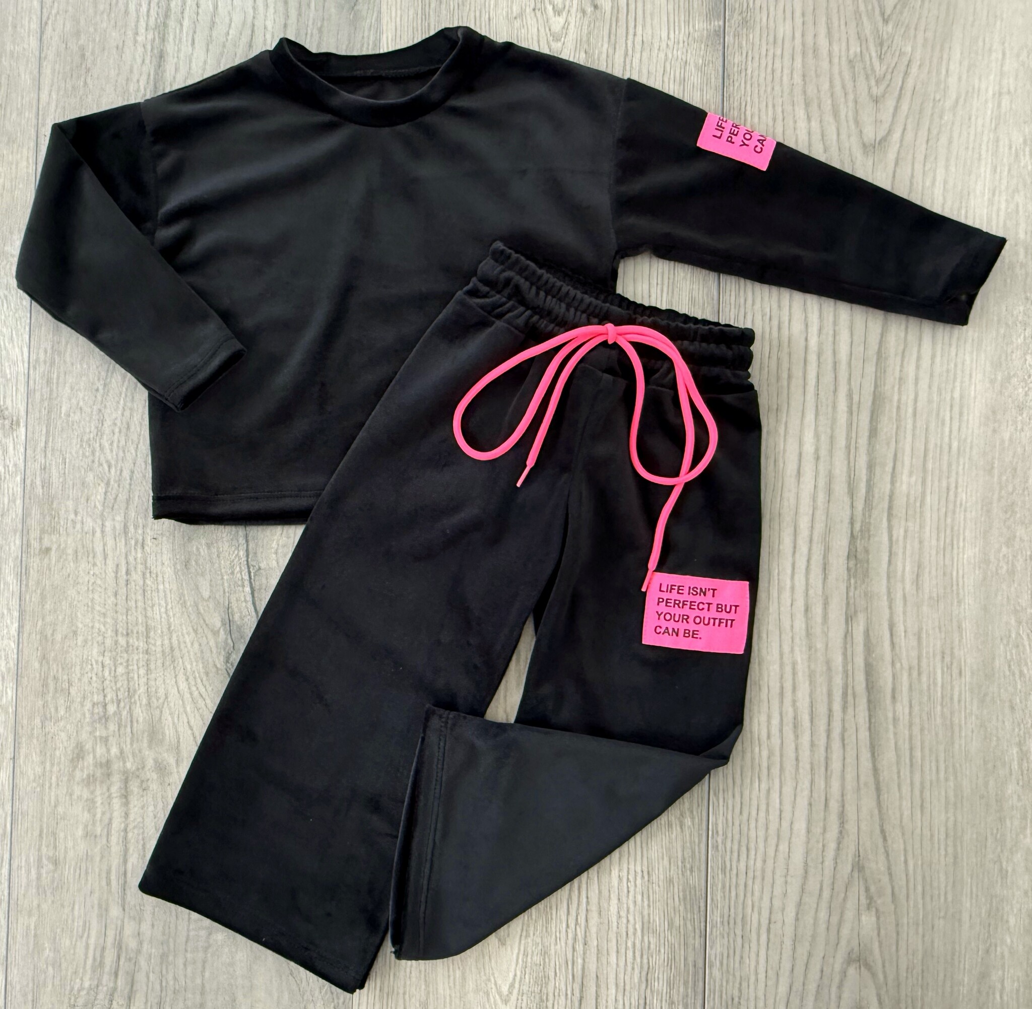 Dit tweedelige meisjes setje is een echte eyecatcher! Zowel het lange mouwen shirt als de flared broek hebben een stoere roze label met de tekst: "Life isn’t perfect but your outfit can be." Het setje is gemaakt van een zachte, comfortabele stretchstof – ideaal om in te spelen én te shinen.