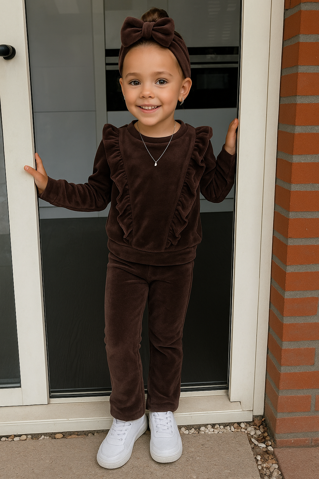 Bruine meisjes set bestaande uit een lange mouwen shirt en een flared broek met tekstlabel op het been. Comfortabel én trendy! Perfect voor meiden wdie houden van fashion. Verkrijgbaar van maat 98/104 t/m 146/152