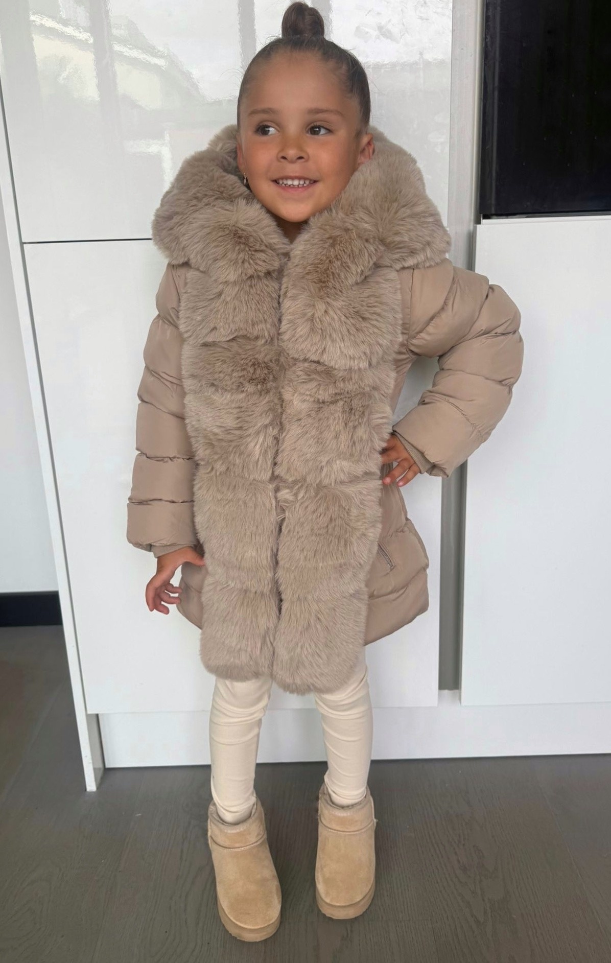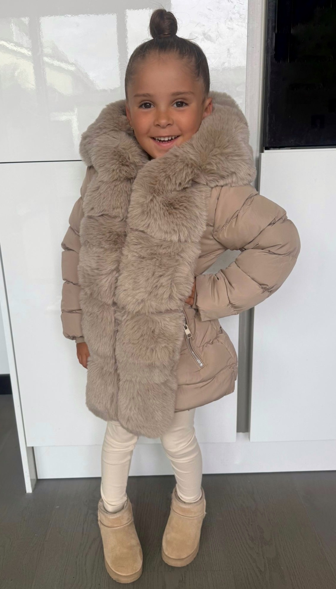 Warme winterparka in taupe voor meisjes met bont. Luxe uitstraling, gevoerd en gewatteerd – ideaal voor koude dagen!