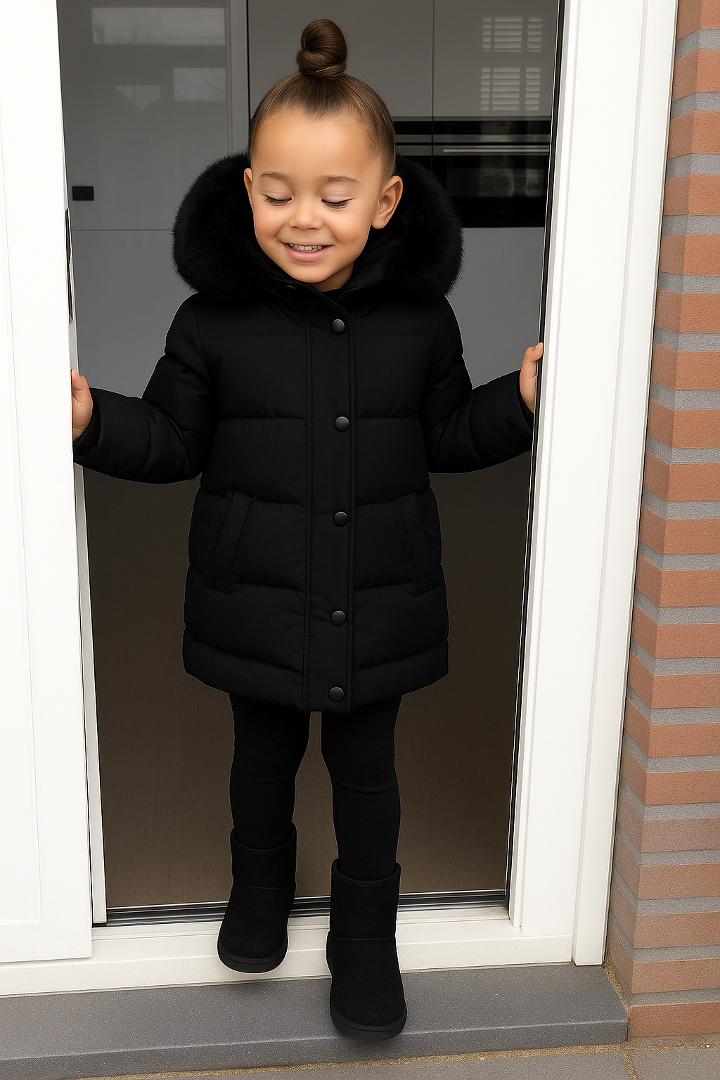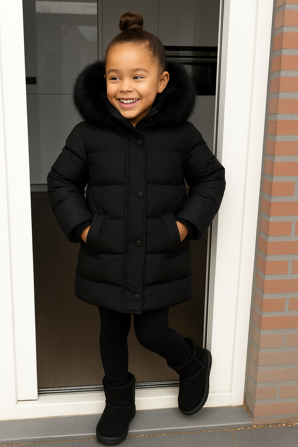 Warme winterparka in zwarr voor meisjes met grote fluffy kraag. Luxe uitstraling, gevoerd en gewatteerd – ideaal voor koude dagen!