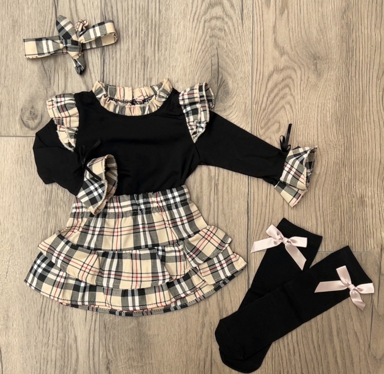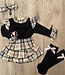 Compleet meisjes setje met ruitrok, top, kniekousen met strik en bijpassende haarband. Comfortabel én super stijlvol voor elke gelegenheid!