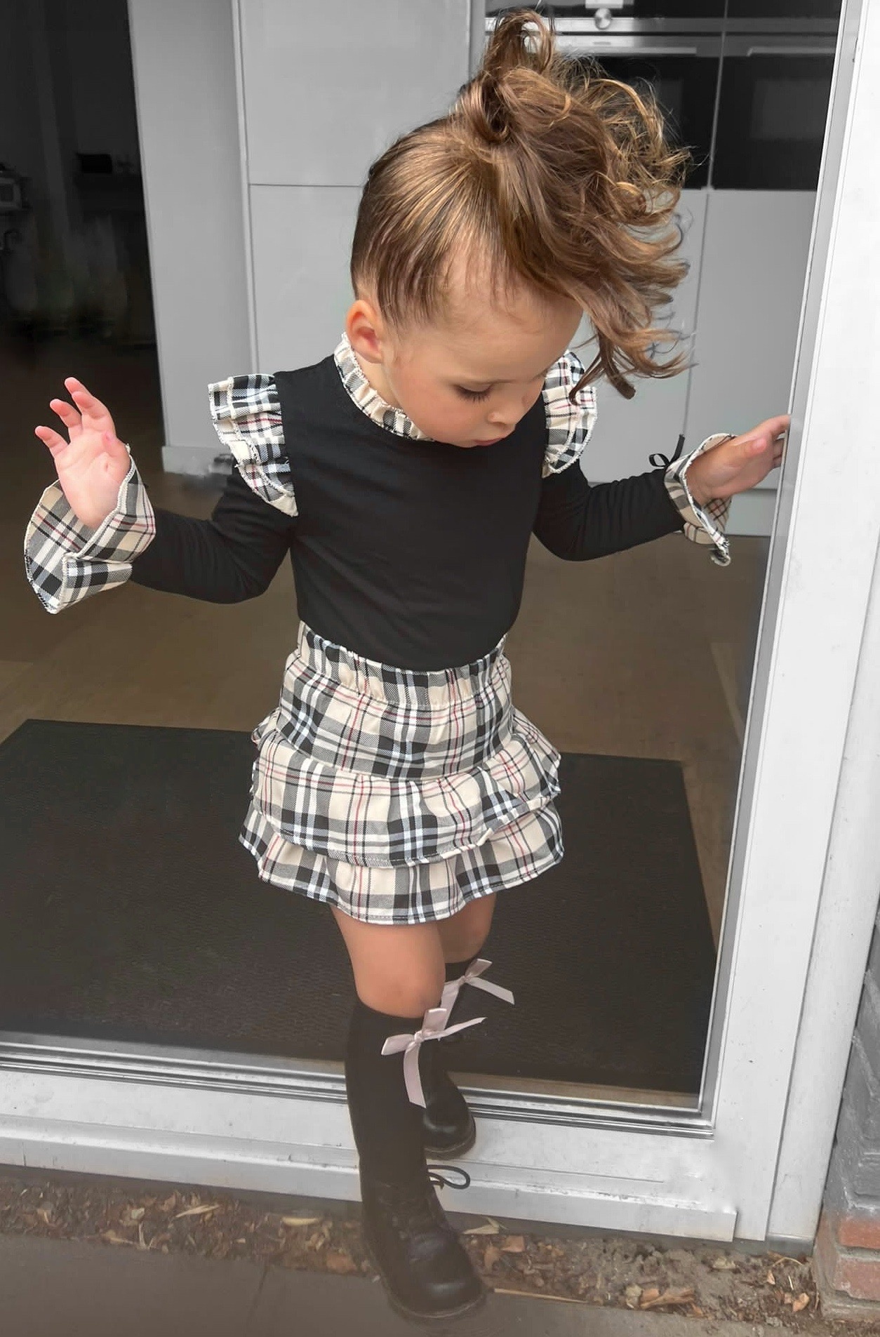 Deze geruite meisjes set is een perfecte mix van klassiek en schattig. De zwarte blouse heeft geruite ruffle details op de schouders en mouwen, en het rokje heeft dezelfde stijlvolle ruitprint.
