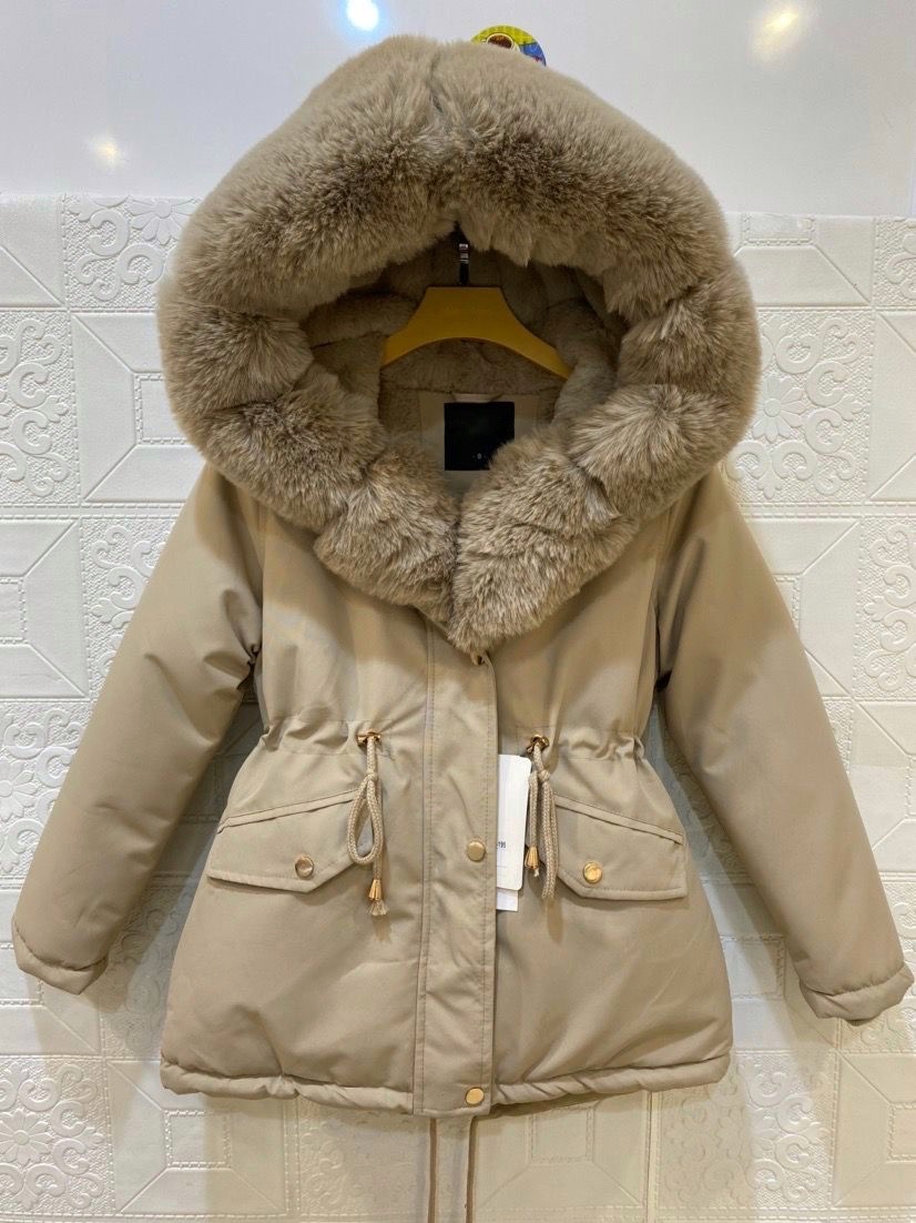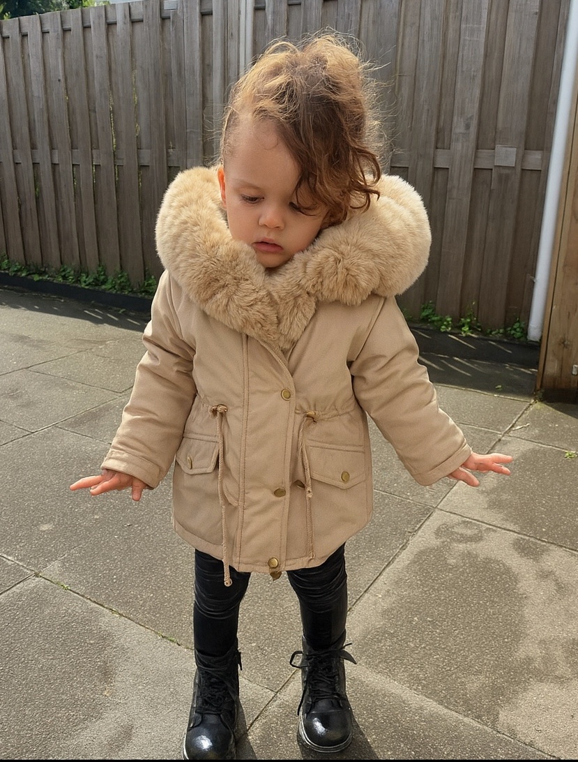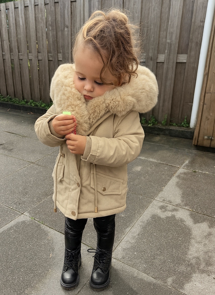 Warme winterparka in taupe voor meisjes met grote fluffy kraag. Luxe uitstraling, gevoerd en gewatteerd – ideaal voor koude dagen!