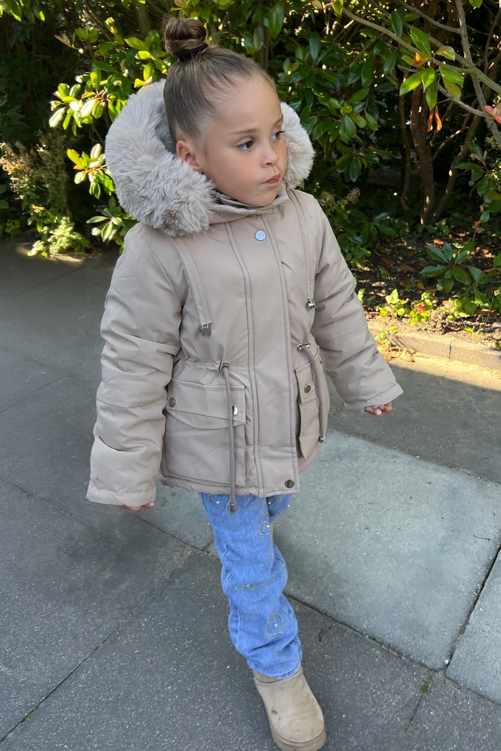Warme winterparka in taupe voor meisjes met grote fluffy kraag. Luxe uitstraling, gevoerd en gewatteerd – ideaal voor koude dagen!