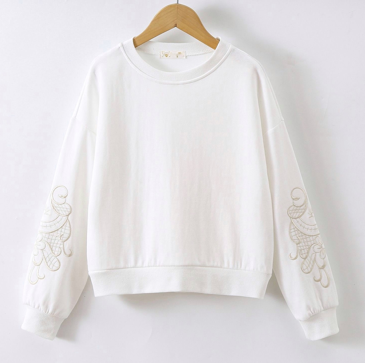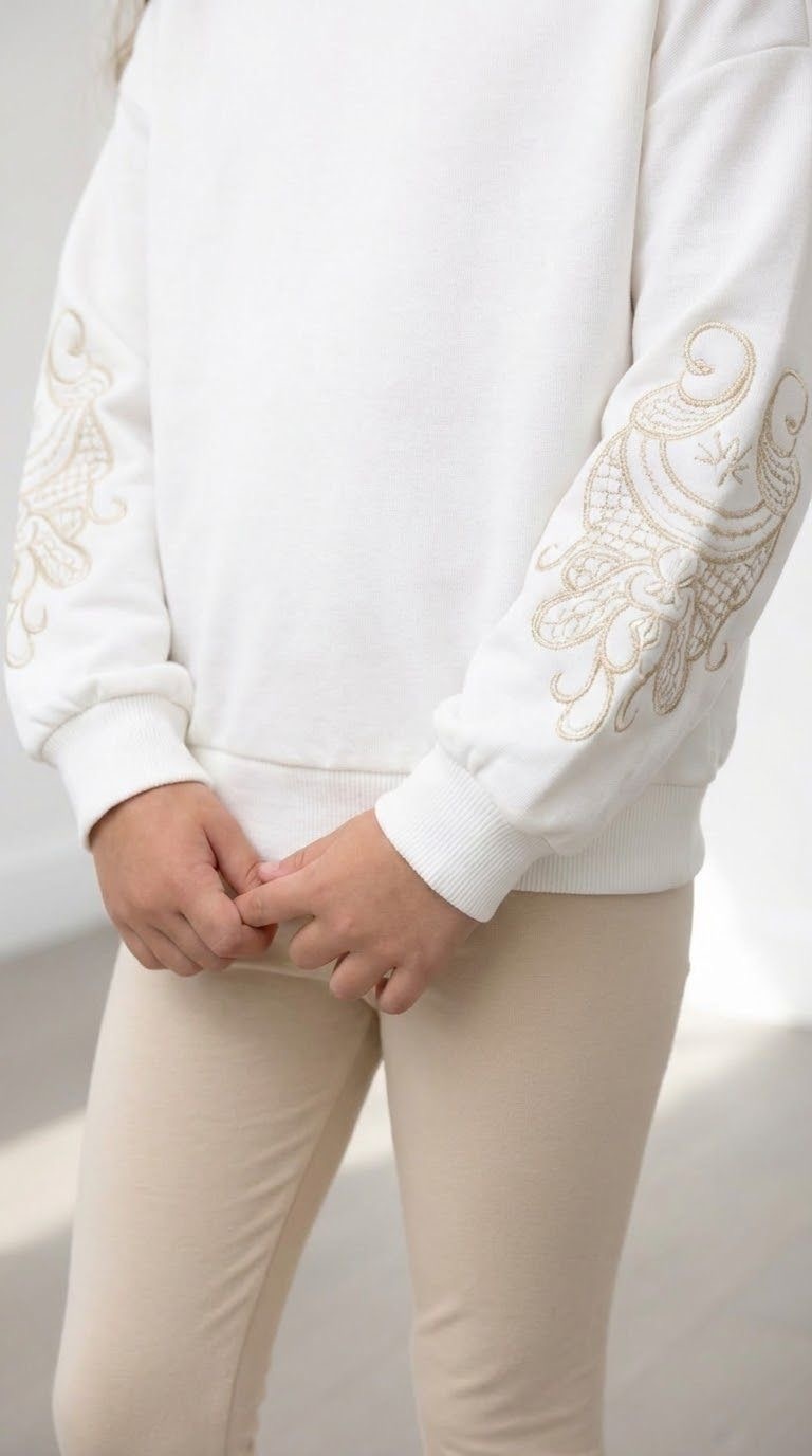 Stijlvolle witte sweater voor meisjes met subtiel borduurdetail op de mouwen. Zacht, comfortabel en makkelijk te combineren. Perfect voor dagelijks gebruik. Verkrijgbaar in maat 98/104 t/m 158/164.