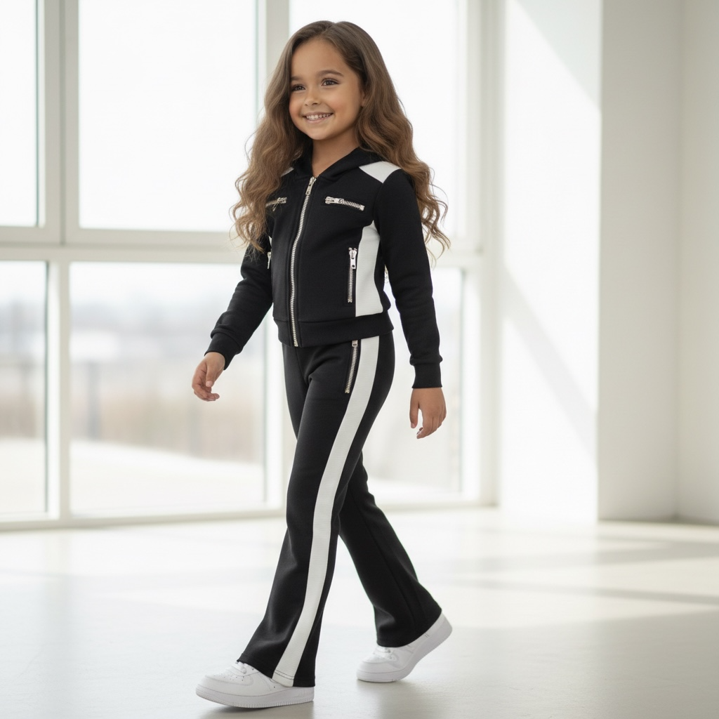 Meisjes set bestaande uit een vest en een flared broek. Comfortabel én trendy! Perfect voor meiden die houden van fashion. Verkrijgbaar van maat 98/104 t/m 158/164.